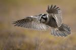 The northern hawk-owl (Surnia ulula) is a non-migratory owl that usually stays within its breeding range, though it sometimes irrupts southward. It is one of the few owls that is neither nocturnal nor crepuscular, being active only during the day. This is the only living species in the genus Surnia of the family Strigidae. The species is sometimes called simply the hawk owl; however, many species of owls in the genus Ninox are also called “hawk owls”.